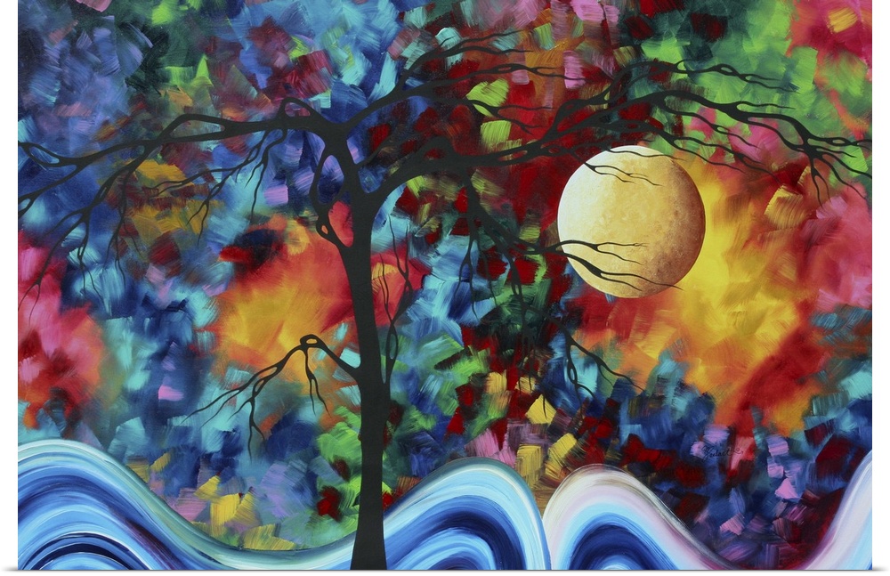<p>Whimsical contemporary abstract painting of a tree silhouette with a multicolored paint daubed background. There are also curvy lines representing water and a full moon in the background.</p>