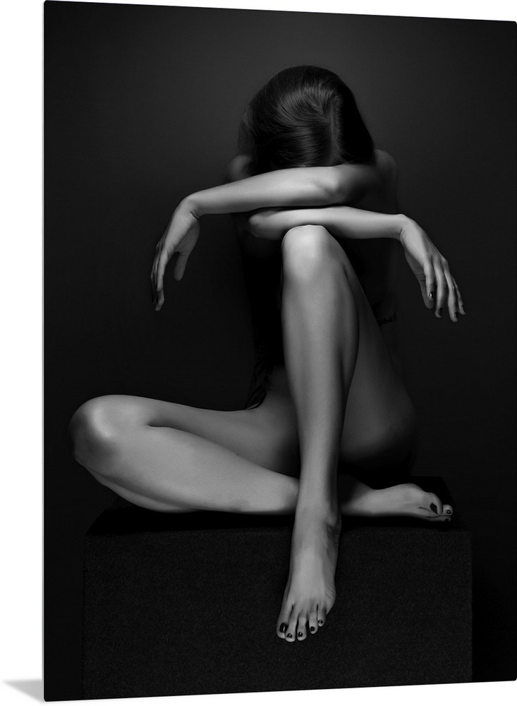 <p>Black and white fine art photograph of a woman sitting down, creating angles with her body, resembling a sculpture.</p>