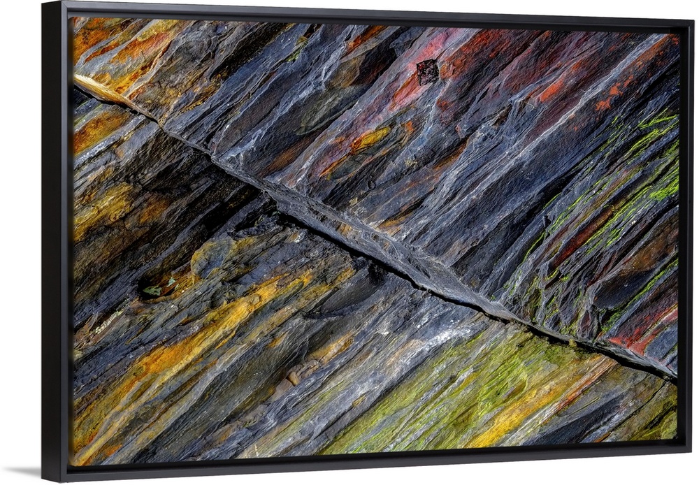 <p>Photograph of a cross section view of colorful rock displaying layers of age.</p>