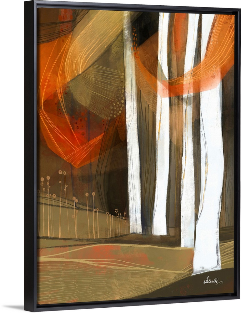 <p>A very contemporary painting of white birch tree trunks with swirls of orange and yellow paint representing fall foliage</p>