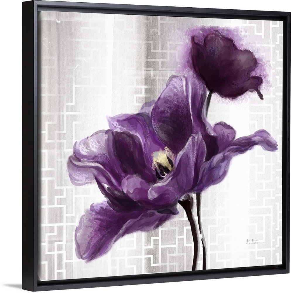 <p>Contemporary home decor art of purple flower against a silver patterned background.</p>