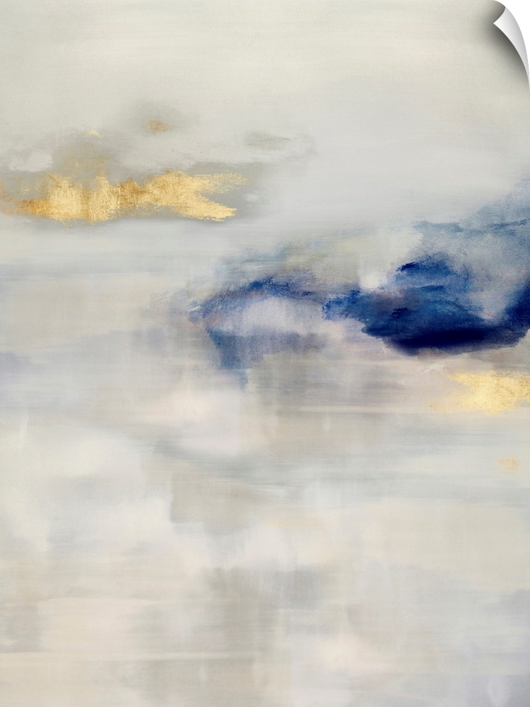 <p>Contemporary abstract artwork in muted blue and white tones with gold colored brush accents.</p>