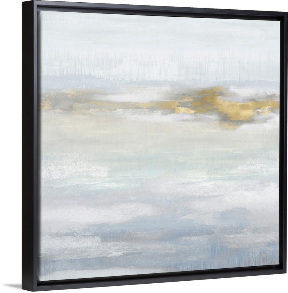 <p>Contemporary abstract artwork in muted blue and gray tones with gold colored brush accents.</p>