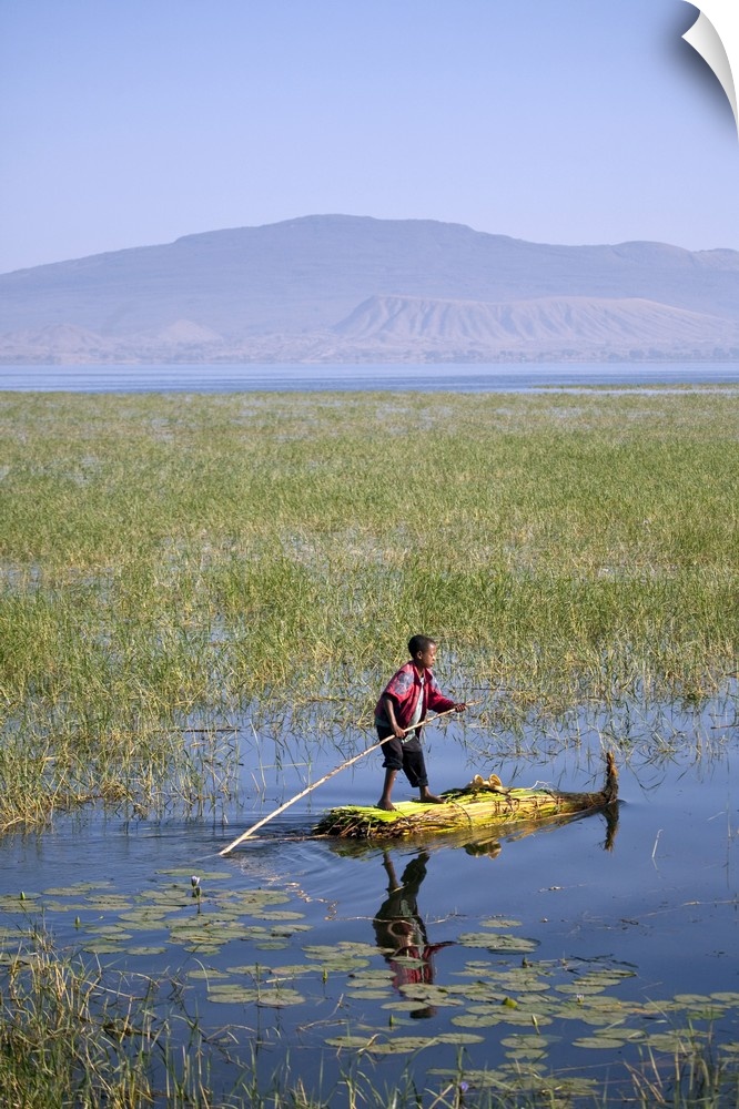 <p>Ethiopia, Lake Awassa. A young boy punts a traditional reed Tankwa through the reeds.</p>