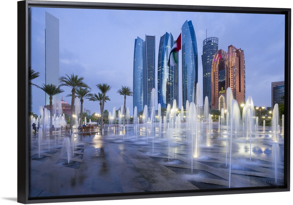 <p>Etihad Towers time lapse viewed over the fountains of the Emirates Palace Hotel, Abu Dhabi, United Arab Emirates, Middle East</p>