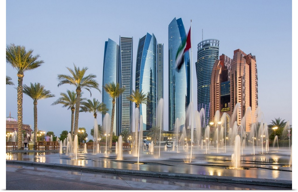 <p>Etihad Towers time lapse viewed over the fountains of the Emirates Palace Hotel, Abu Dhabi, United Arab Emirates, Middle East</p>