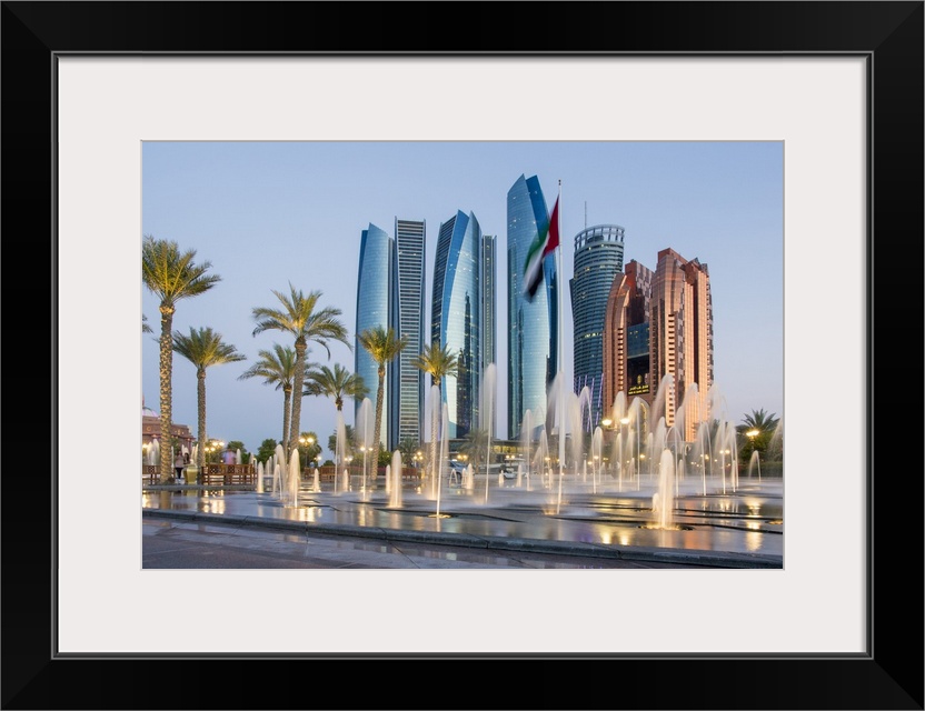 <p>Etihad Towers time lapse viewed over the fountains of the Emirates Palace Hotel, Abu Dhabi, United Arab Emirates, Middle East</p>
