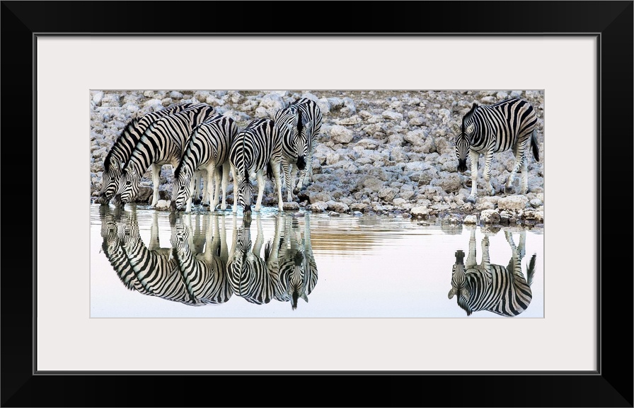 <p>Etosha National Park, Etosha, Namibia, Africa. Reflections Zebras at a watering hole.</p>
