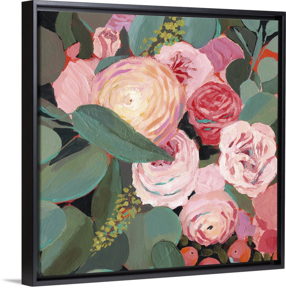 <p>This whimsical artwork features an abundance of flowers in romantic hues of red and pink that drape over the greenery.</p>