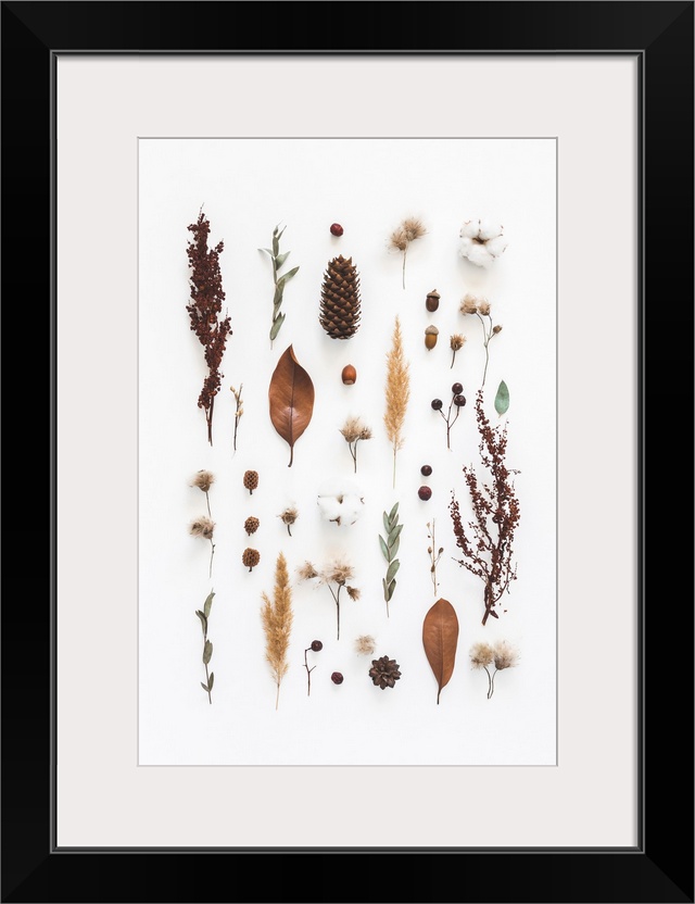 <p>Autumn composition. Pattern made of eucalyptus branches, cotton flowers, dried leaves on white background. Autumn, fall concept. Flat lay, top view.</p>