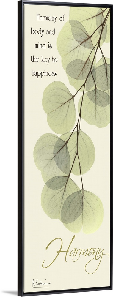 <p>Vertical x-ray photograph of eucalyptus leaves, against a warm tone background. With the word "Harmony" at the bottom of the image.</p>