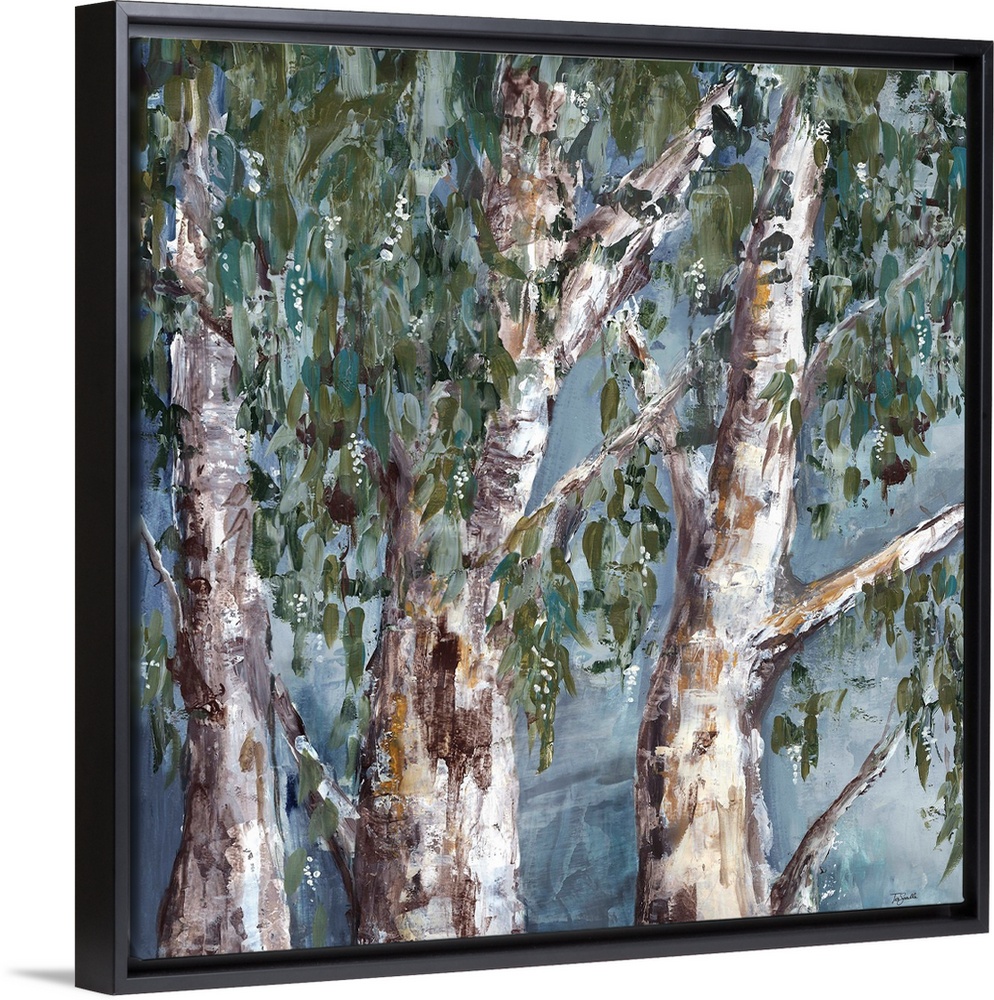 <p>A square contemporary painting of a group of eucalyptus trees in textured muted tones.</p>