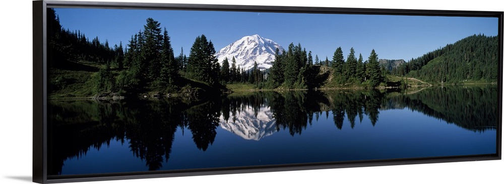 <p>Panoramic photograph of Mount Rainier and surrounding green forest, reflecting in the still waters of Eunice Lake, in Mount Rainier National Park, Washington.</p>