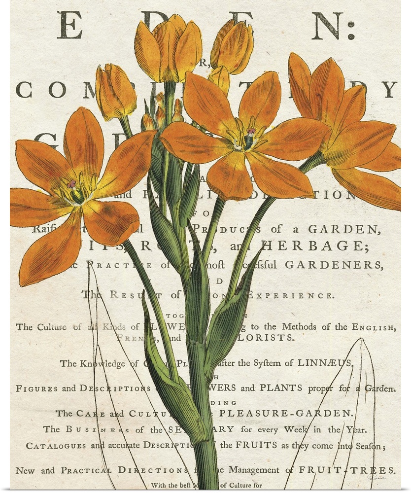 <p>Vintage stylized illustration of an orange euphorbia against a cream background with text.</p>