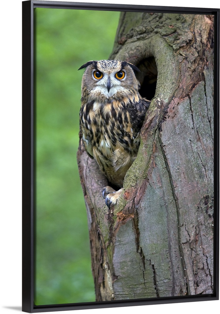 <p>Eurasian Eagle-Owl (Bubo bubo) looking out from a tree cavity, Netherlands</p>