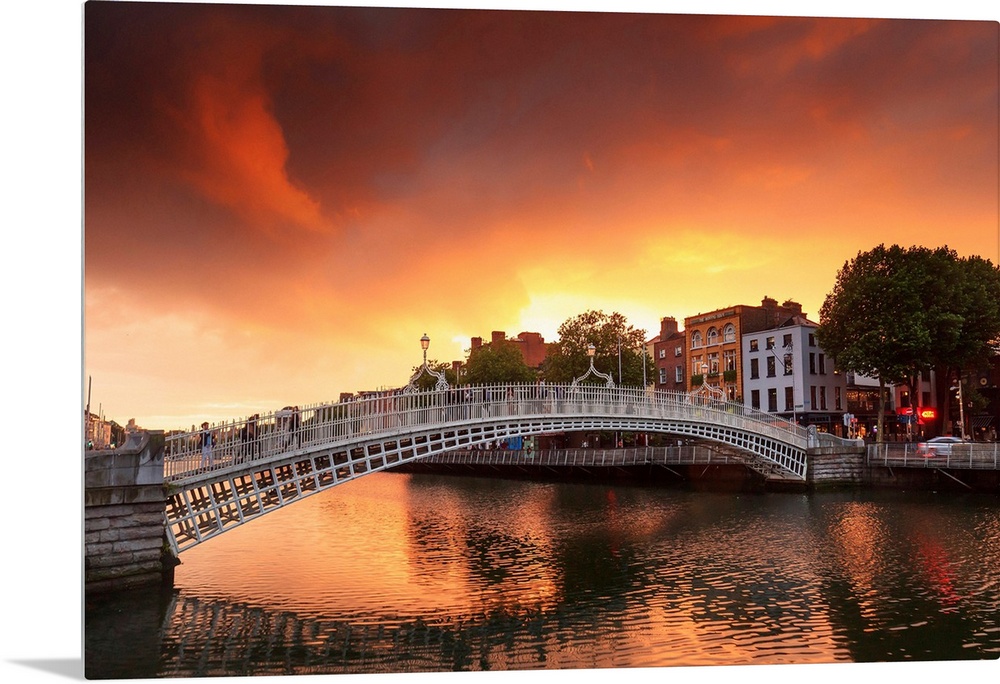 <p>Europe, Dublin, Ireland, people crossing Halfpenny bridge on the Liffey river at sunset</p>