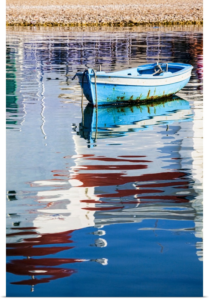 <p>Europe, Greece, Mykonos, Hora, Fishing Boat and Reflection of a Church in the Water.</p>