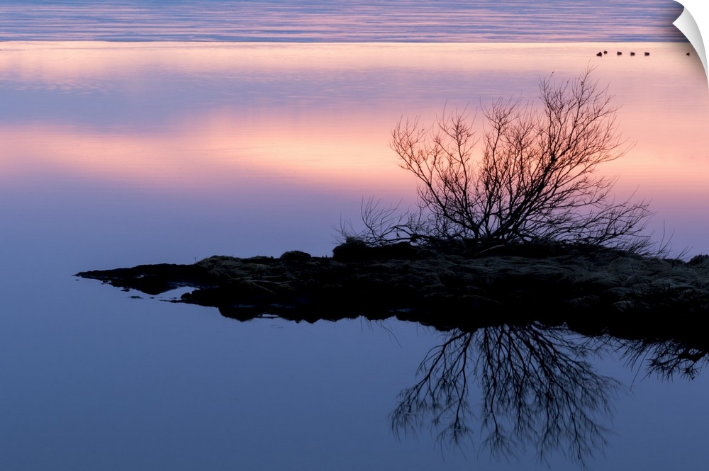 <p>Europe, Iceland, North Iceland, near Lake Myvatn, Reykjahlio. A colorful sunset is reflected in a tundra pond.</p>