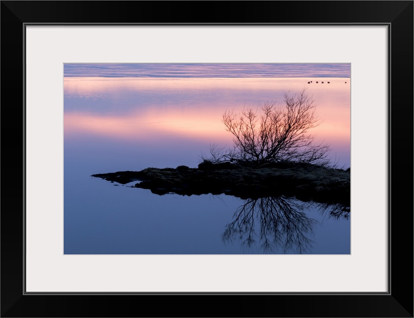 <p>Europe, Iceland, North Iceland, near Lake Myvatn, Reykjahlio. A colorful sunset is reflected in a tundra pond.</p>