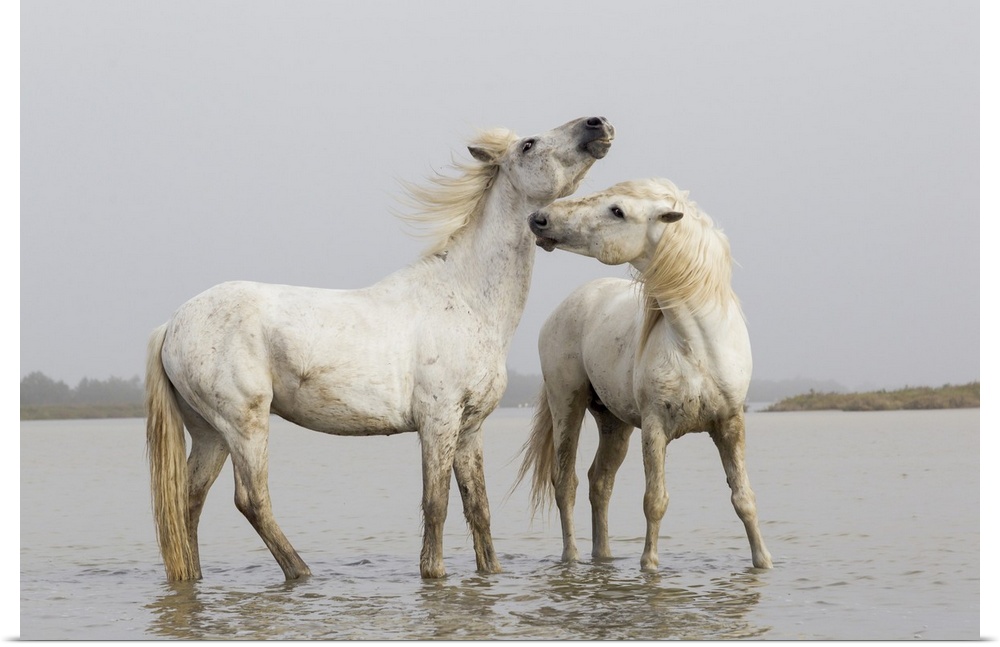 <p>Europe, France, The Camargue, Saintes-Maries-de-la-Mer, Camargue horses, Equus ferus caballus camarguensis. Two Camargue stallions interacting.</p>
