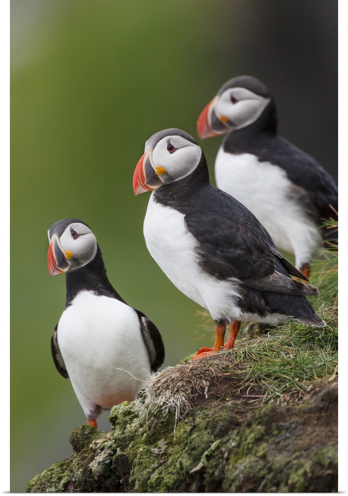<p>Europe, Iceland, Westfjords, Atlantic puffins, Fratercula arctica. A group of Atlantic puffins on a steep grassy hillside.</p>