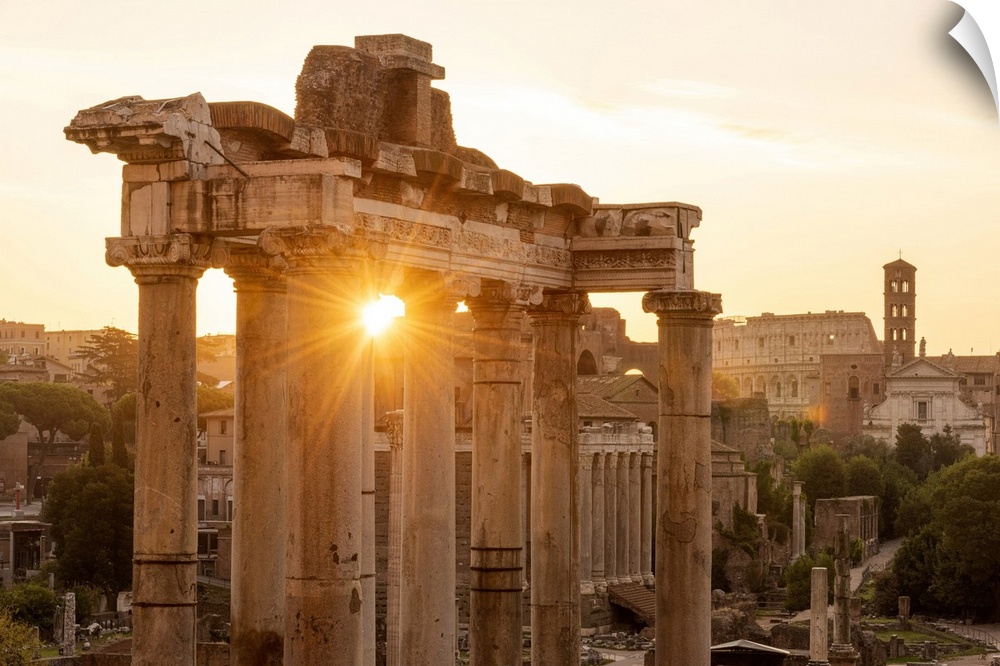 <p>Europe, Italy, Rome. The Forum Romanum with the temple of Saturn in the rising sun.</p>
