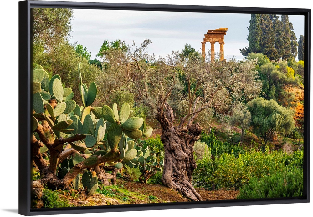 <p>Europe, Italy, Sicily. Agrigento, the re-assembled remains of the temple of the Dioscuri and in the foreground an ancient olive tree.</p>