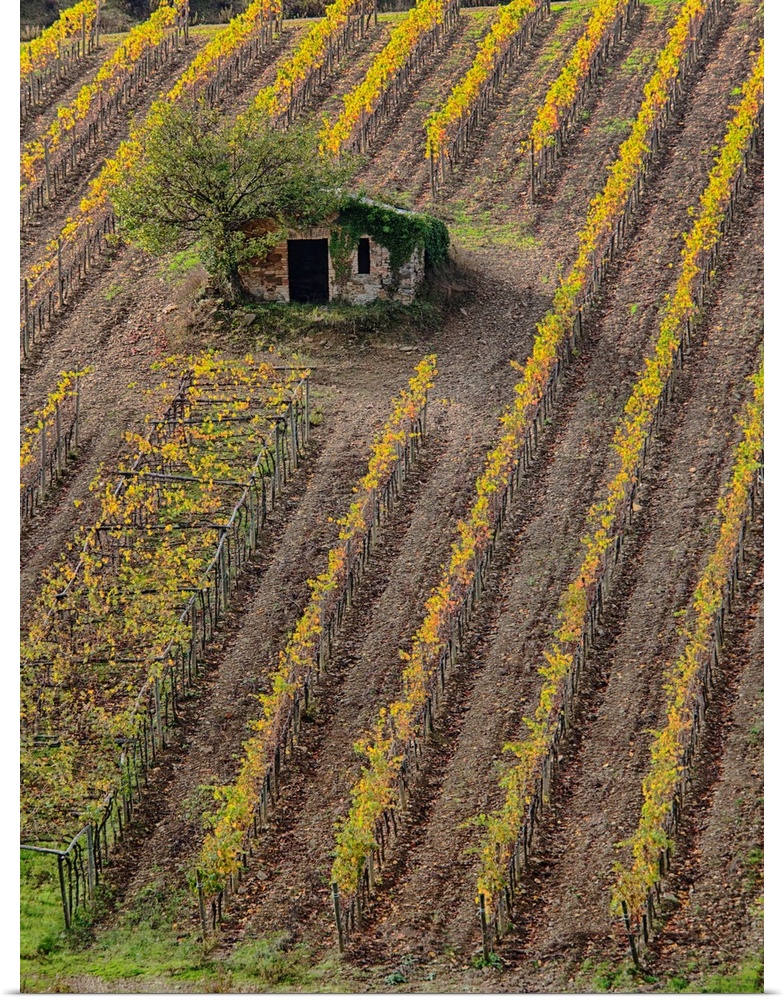 <p>Europe, Italy, Tuscany, Monticiano, Small Shed in Harvest Vineyard.</p>