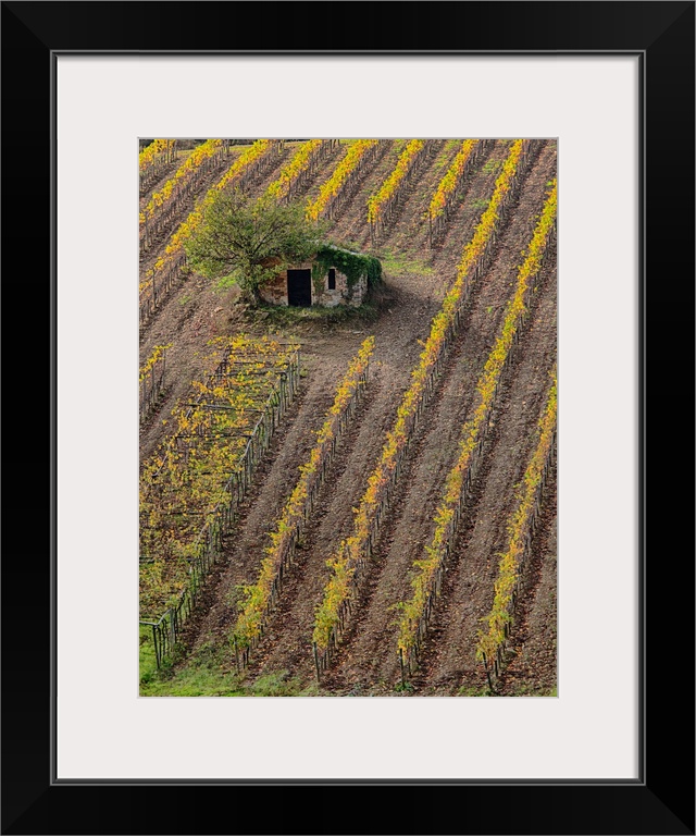 <p>Europe, Italy, Tuscany, Monticiano, Small Shed in Harvest Vineyard.</p>