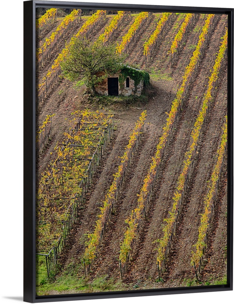 <p>Europe, Italy, Tuscany, Monticiano, Small Shed in Harvest Vineyard.</p>