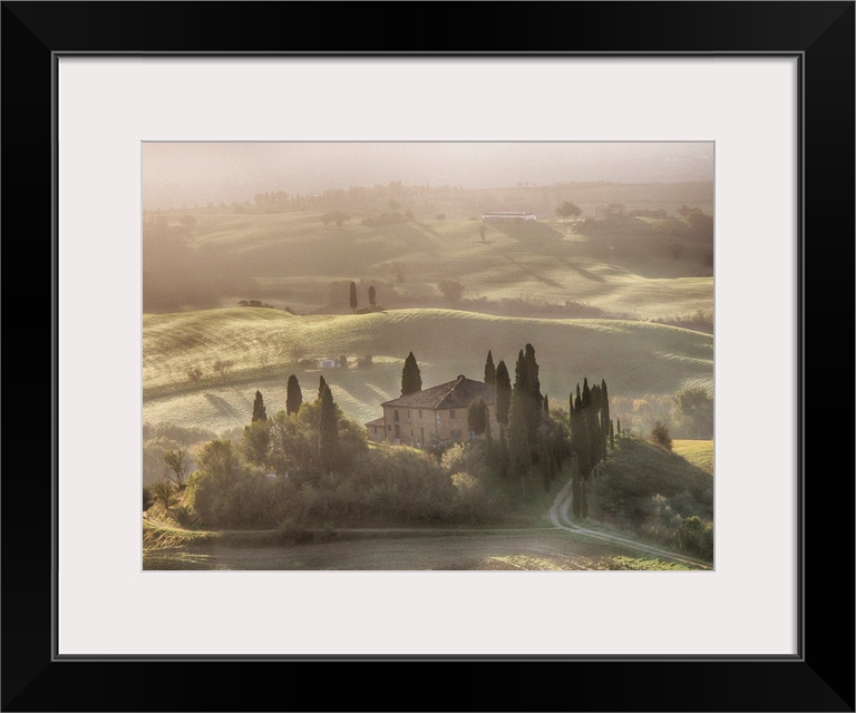 <p>Europe, Italy, Tuscany, Morning light filters through the fog at Belvedere House.</p>