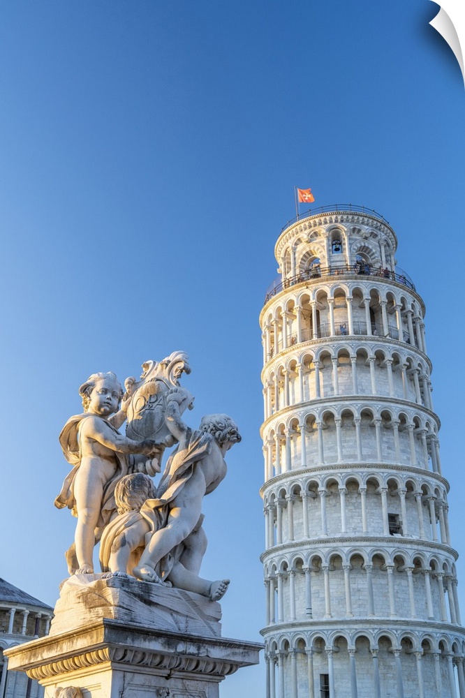 <p>europe, Italy, Tuscany, Pisa. Piazza dei Miracoli with the leaning tower and the sculpture of angels.</p>