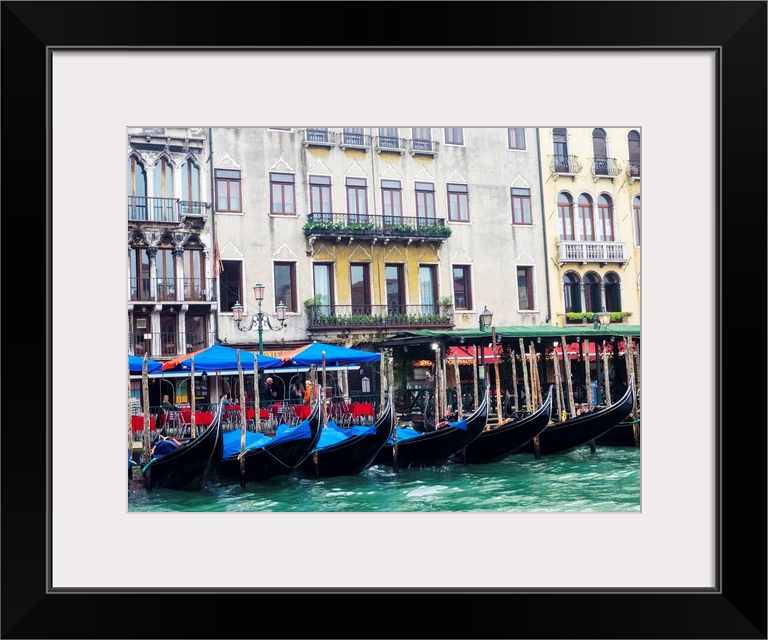 <p>Europe, Italy, Venice, Buildings along the Grand Canal with Gondolas parked.</p>