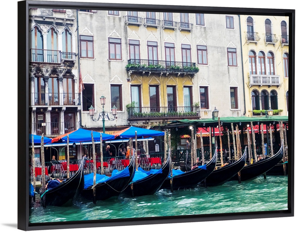 <p>Europe, Italy, Venice, Buildings along the Grand Canal with Gondolas parked.</p>