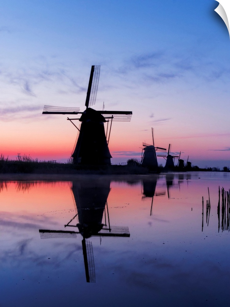 <p>Europe, Netherlands, Kinderdijk, Windmills at Sunrise along the canals of Kinderdijk.</p>