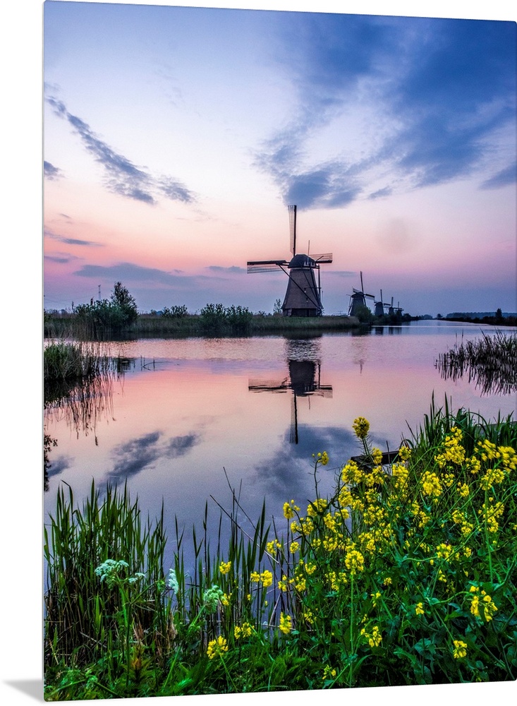 <p>Europe, Netherleands, Kinderdyk, Windmills at Sunrise along the canals of Kinderdijk.</p>