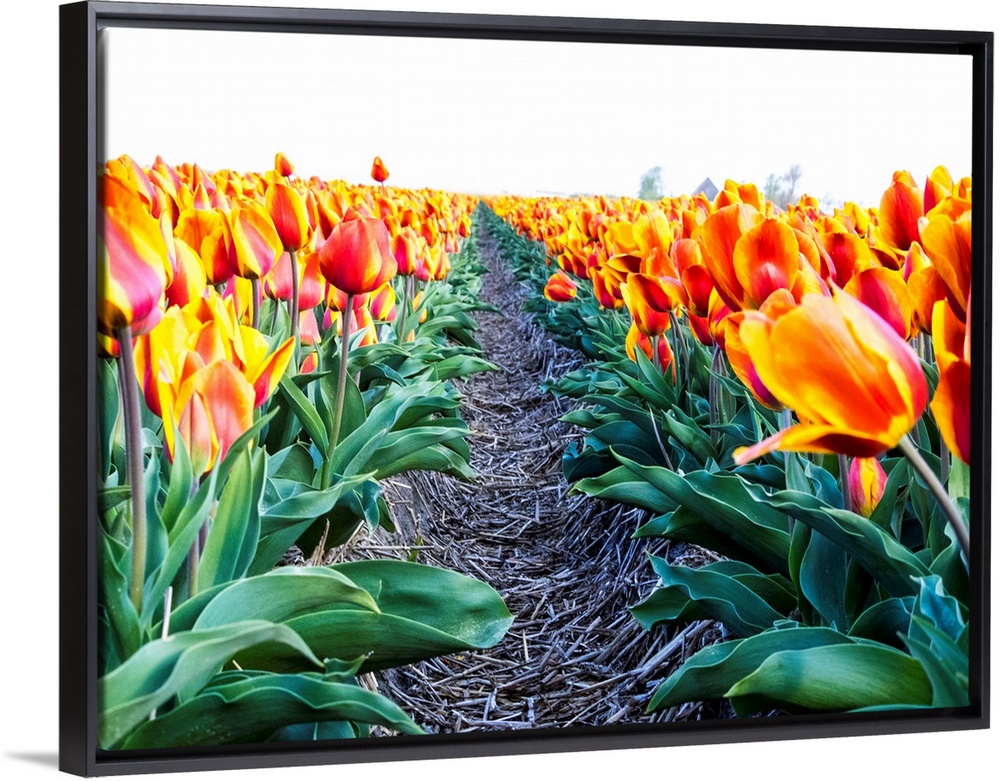<p>Europe, Netherlands, Nord Holland, Tulip Row of bright Orange and Yellow Tulips.</p>