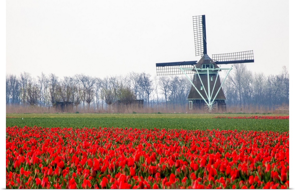 <p>Europe, Netherlands, Old Wooden Windmill in a Field of Red Tulips.</p>