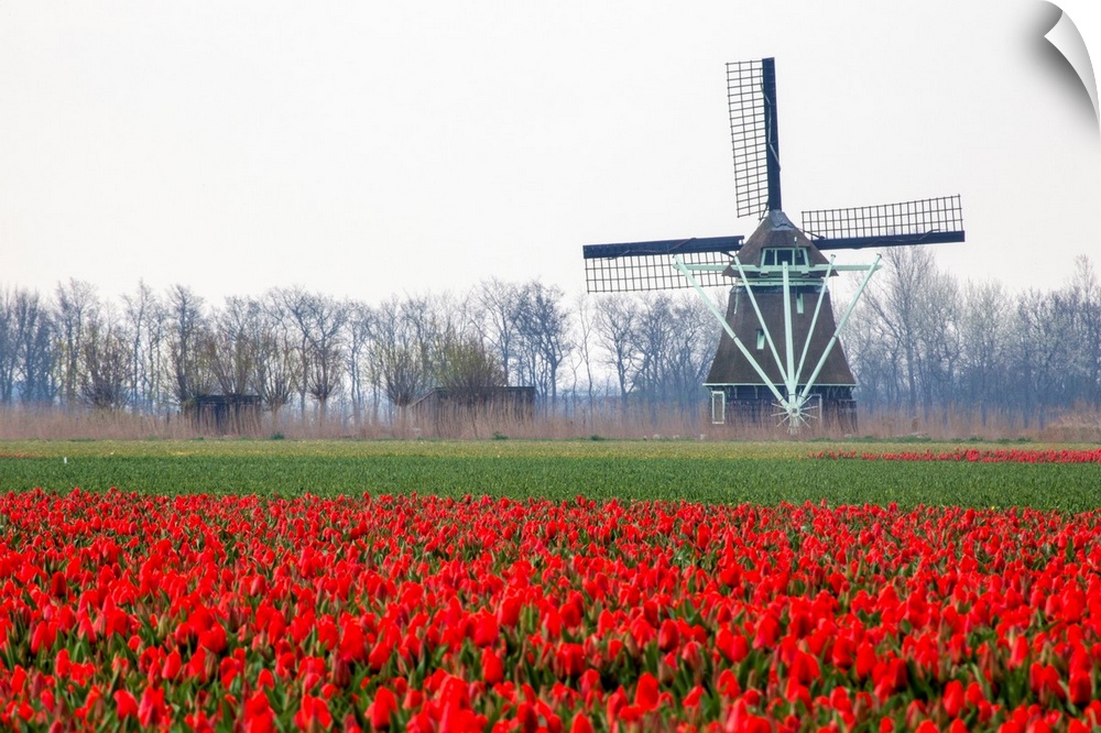 <p>Europe, Netherlands, Old Wooden Windmill in a Field of Red Tulips.</p>