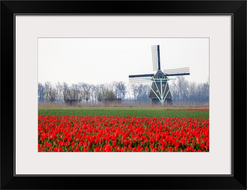 <p>Europe, Netherlands, Old Wooden Windmill in a Field of Red Tulips.</p>