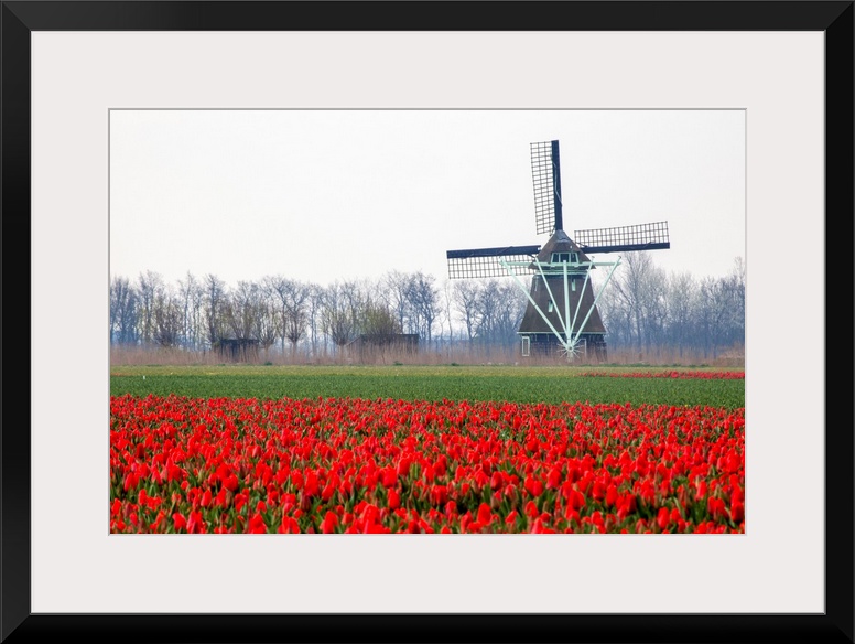 <p>Europe, Netherlands, Old Wooden Windmill in a Field of Red Tulips.</p>