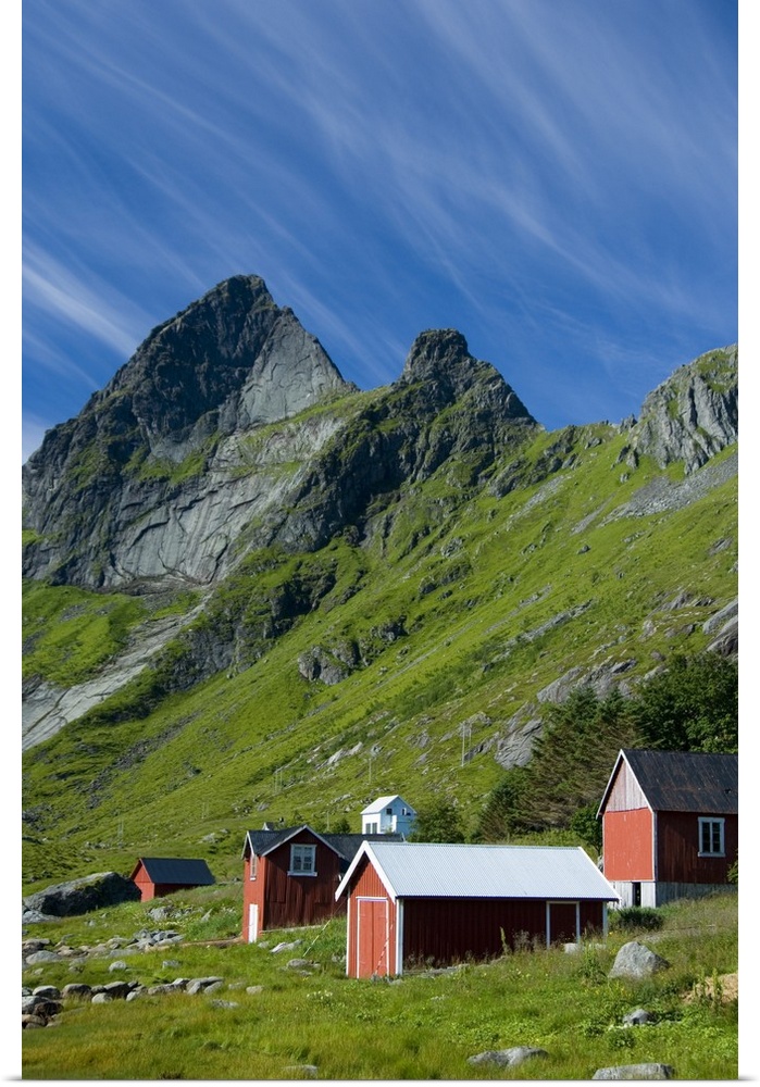 <p>Europe, Norway, Lofoten. Houses in Vindstad below Rabbtinden.</p>