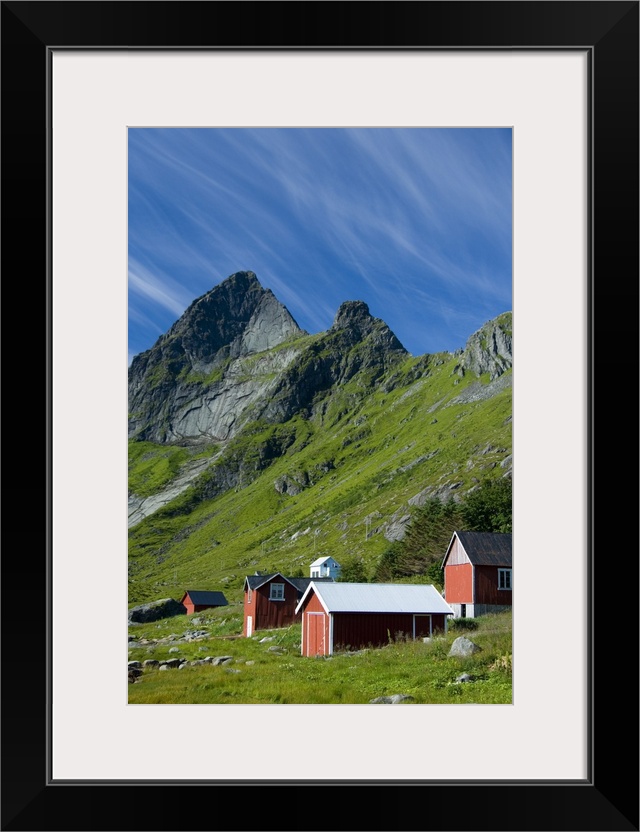 <p>Europe, Norway, Lofoten. Houses in Vindstad below Rabbtinden.</p>
