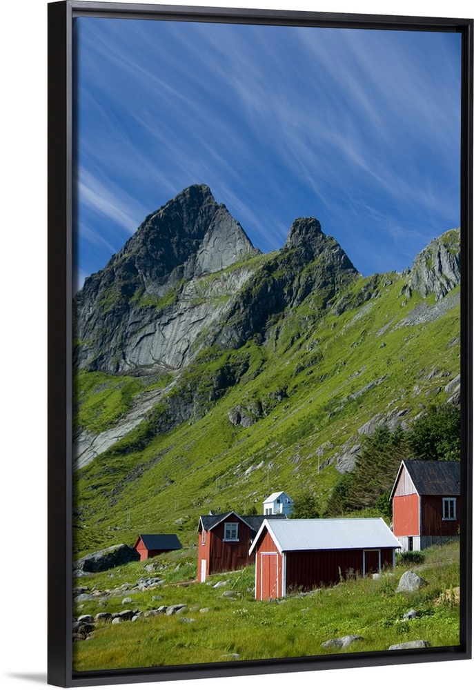 <p>Europe, Norway, Lofoten. Houses in Vindstad below Rabbtinden.</p>