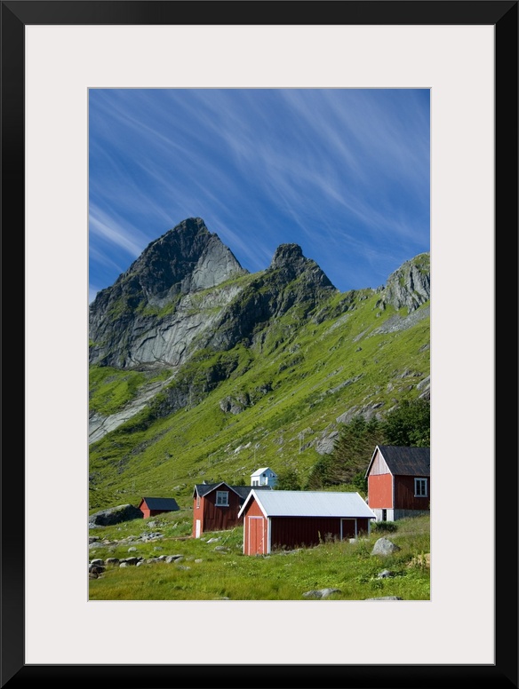 <p>Europe, Norway, Lofoten. Houses in Vindstad below Rabbtinden.</p>