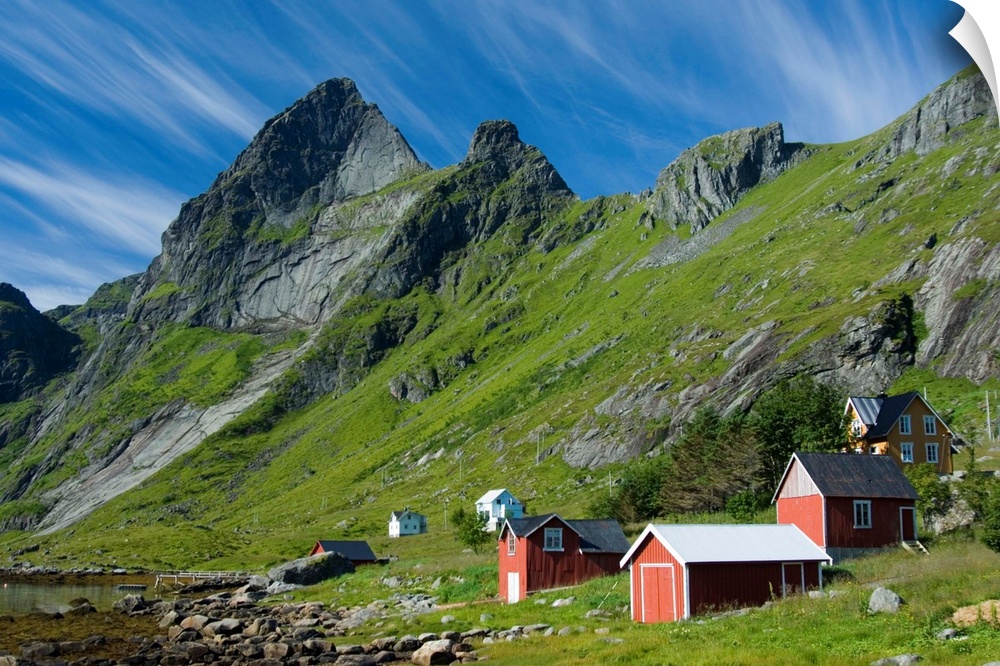 <p>Europe, Norway, Lofoten. Houses in Vindstad below Rabbtinden.</p>
