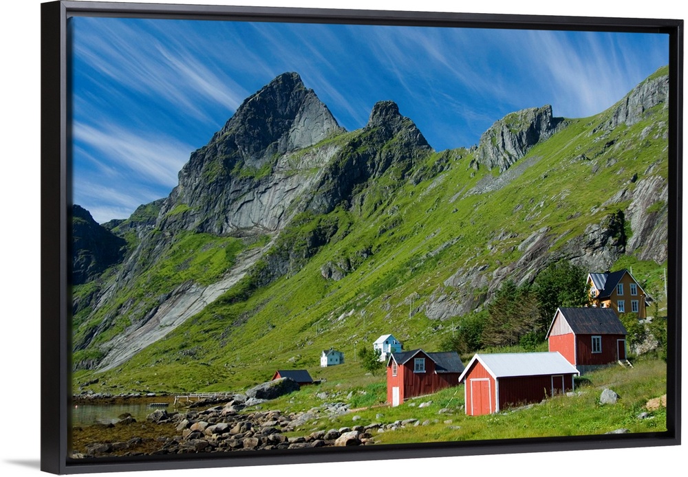 <p>Europe, Norway, Lofoten. Houses in Vindstad below Rabbtinden.</p>