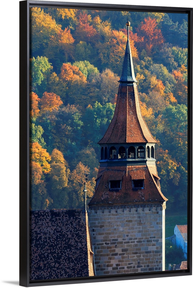 <p>Europe, Romania, Brasov, Council Square, Piata Sfatului, Brasov historical Black Church spire.</p>