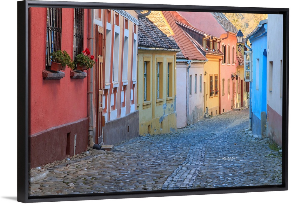 <p>Europe, Romania, Sighisoara, cobblestone residential street of colorful houses in village. UNESCO World Heritage Site.</p>