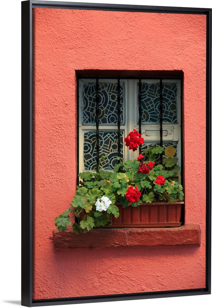 <p>Europe, Romania, Sighisoara, residential window in old town. Flowers in window.</p>
